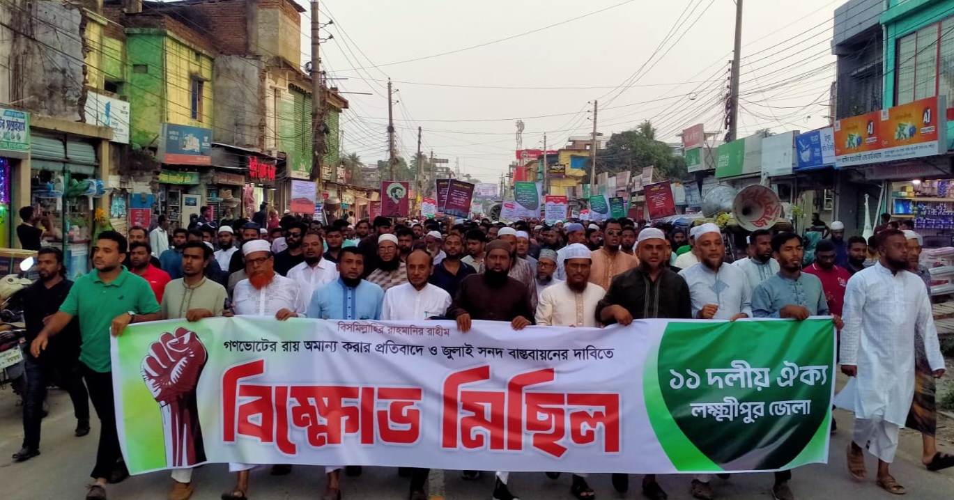 লক্ষ্মীপুরে গণভোটের রায় অমান্যের প্রতিবাদসহ জুলাই সনদ বাস্তবায়নের দাবিতে জামায়াত ইসলামী নেতৃত্বাধীন ১১ দলীয় ঐক্য বিক্ষোভ মিছিল করেছে। রোববার (১২ এপ্রিল) বিকেলে লক্ষ্মীপুর শহরের দক্ষিণ তেমুহনী এলাকা থেকে বিক্ষোভ মিছিলটি শুরু হয়ে উত্তর তেমুহনী গিয়ে শেষ হয়।